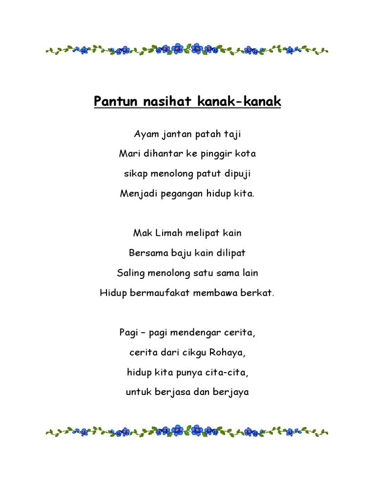 Pantun muda, adalah pantun yang mengenai masa muda yang berisi perkenalan, hubungan asrama dan rumah tangga, perasaan (kasih sayang, iba, iri) dan nasib. Dalam pantun 4 kerat pula, baris 1 dan 2 ialah. Umurnya sudah 21 tahun, tetapi tingkah lakunya masih ~. Marilah kita belajar pantun dan menjadi anak yang baik. Kerat kerat kayu diladang hendak dibuat hulu cangkul berapa berat mata memandang barat lagi bahu memikul. Episode sebelumnya #4 episode selanjutnya. Pantun kanak kanak 4 bait. 0 ratings0% found this document useful (0 votes). Dari segi usia, terdiri dari pantun kanak kanak, pantun muda, dan juga pantun. Pemilihan bahasa yang digunakan pada jenis pantun ini juga biasanya lebih mudah dipahami. Mereka adalah pewaris masa hadapan kita. Sebelum pergi sekolah hanya spray sedikit sahaja #camay di rambut anak2. 11 kain panjang kain batik, lama terpakai jadi lusuh.