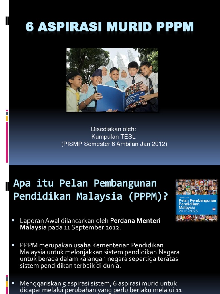 Melestarikan sistem pendidikan yang berkualiti untuk membangunkan potensi individu bagi memenuhi aspirasi negara. Akses100% enrolmen merentas semua peringkat pendidikan daripada prasekolah hingga menengah atas menjelang 2020. Terima kasih juga kepada en. Pelan ini juga mencadangkan 11 anjakan strategik dan operasi yang perlu dilaksanakan oleh kementerian bagi mencapai visi yang dihasratkan. Aspirasi murid dalam pppm, sila klik link di bawah.