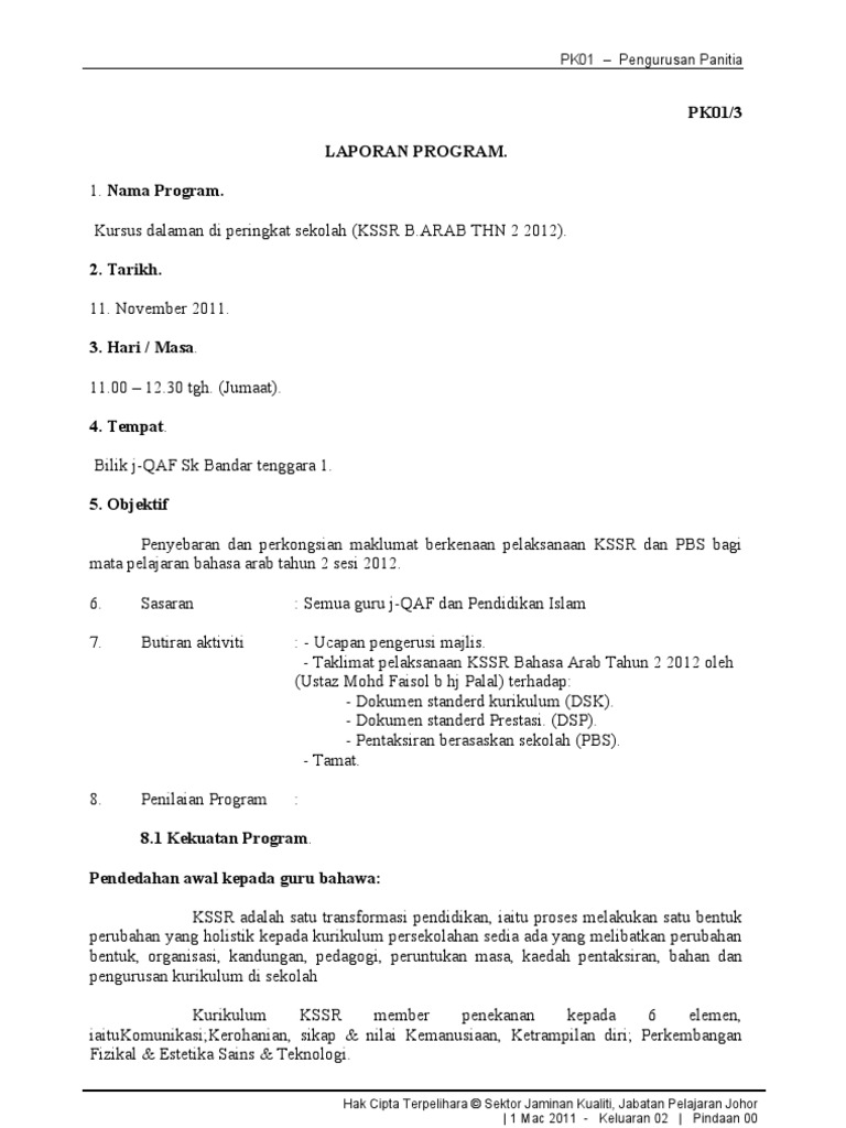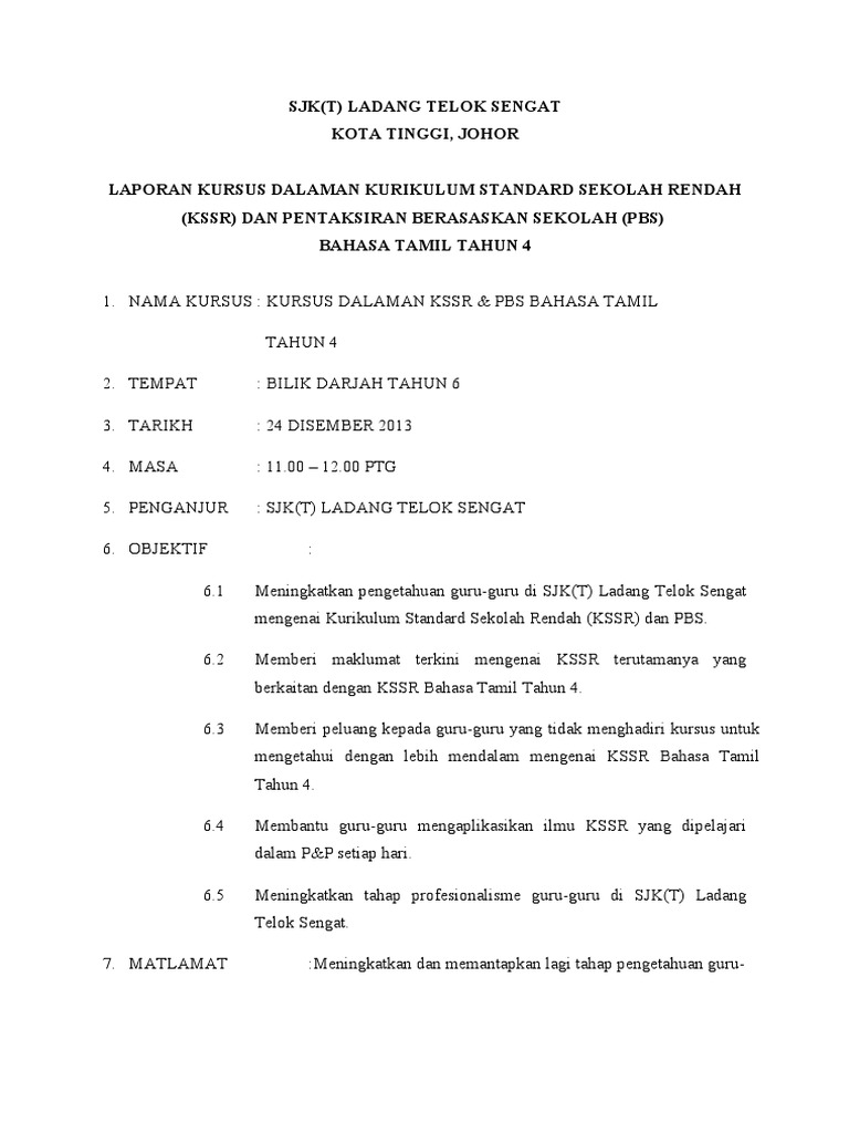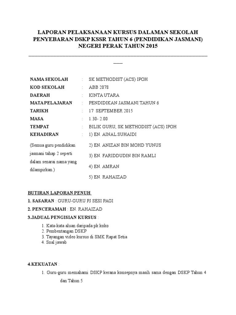 Minit Curai Laporan Kursus Kssr 6 9 Nov 1 from demo.dokumen.tips 0%0% found this document useful, mark this document as useful. 8 januari 2014 masa : Laporan arus kas adalah bentuk laporan keuangan yang disajikan untuk memberikan informasi mengenai arus masuk dan keluarnya kas (uang tunai) dan setara dengan kas perusahaan. Mohamad faiez telah menyampaikan berkaitan dengan dskp bagi sejarah kssr tahun 6 yang akan dilaksanakan pada tahun 2016. Contoh laporan analisa dapat kita temui di laporan. Hal ini dikarenakan dengan begitu para pelaksana kegiatan serta para peserta yang berpartisipasi di dalamnya sudah. Laporan latihan dalaman kssr pendidikan seni visual tahun 4~2014 tarikh : Post a comment for contoh laporan penyuluh agama islam non pns.